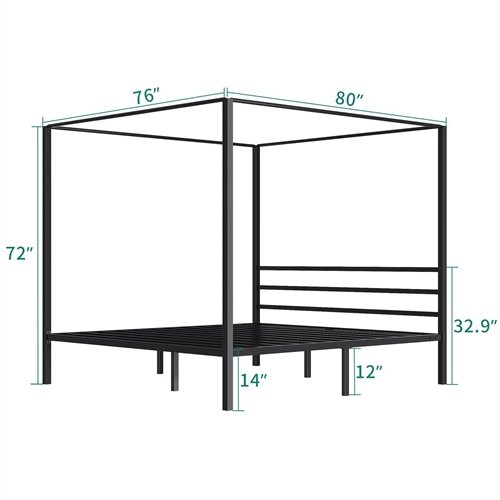 This King size Modern Four Poster Metal Canopy Bed in Black Finish combines a minimalist aesthetic with a gorgeous look in the bedroom and is made from sturdy metal for stability and durability. Comes with baseless safety metal slats and center legs for full support for you and your mattress. The support legs in the middle of the bed frame can improve overall stability. The sturdy slats provide strong support and prevent the mattress from sagging, which can prolong the life of your mattress. Beneath the canopy, the bed has a storage space of up to 12 inches, where you can store your suitcases and other items. The classic, simple look offers your bedroom a peaceful and harmonious aesthetic. The thick and sturdy frame is made of metal, providing a longer service life. Please follow the instructions, and professional installation recommended Box Spring is Needed.