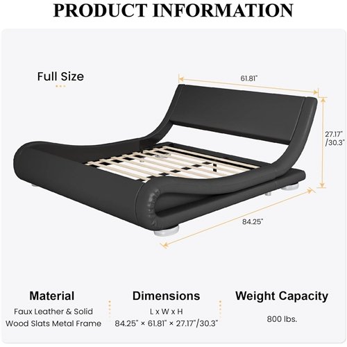 The Full Modern Black Upholstered Platform Bed Frame with Sleigh Curved Headboard has a streamlined design along with a curved headboard which makes your room a contemporary and futuristic aesthetic. 120° 2-level adjustable height headboard gives the waist a comfortable rest, perfect for reading, playing mobile phones, watching TV, etc. The sturdy construction is composed of solid wood slats and heavy-duty steel with a bold round-shape leg design. No squeaky sound. Maximum capacity 800 lbs. Fully embedded design can prevent the mattress from sliding and provide a sweet dream. Mattress + spring box is recommended not to exceed 14 inches. 100% Premium PU leather filled with high-density PP cotton, ultra-soft texture, breathable, easy to clean, wear-resistant.