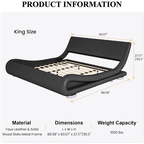 The Full Modern Black Upholstered Platform Bed Frame with Sleigh Curved Headboard has a streamlined design along with a curved headboard which makes your room a contemporary and futuristic aesthetic. 120° 2-level adjustable height headboard gives the waist a comfortable rest, perfect for reading, playing mobile phones, watching TV, etc. The sturdy construction is composed of solid wood slats and heavy-duty steel with a bold round-shape leg design. No squeaky sound. Maximum capacity 800 lbs. Fully embedded design can prevent the mattress from sliding and provide a sweet dream. Mattress + spring box is recommended not to exceed 14 inches. 100% Premium PU leather filled with high-density PP cotton, ultra-soft texture, breathable, easy to clean, wear-resistant.