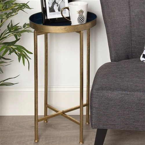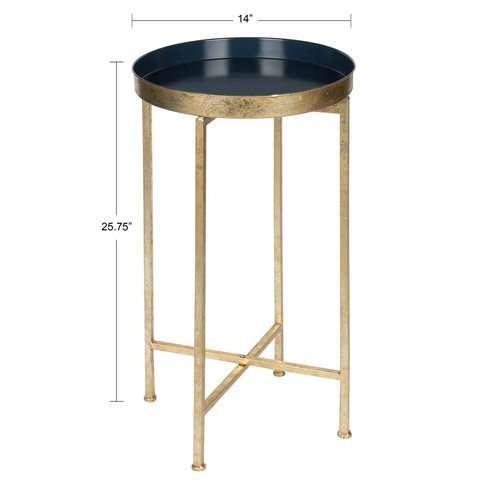 • Gold Finish Metal Round End Table Nightstand with Removable Navy Blue Tray Top