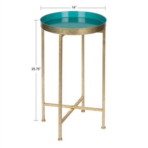 This Gold Finish Metal Round End Table Nightstand with Removable Navy Blue Tray Top brings sleek style to your living room, bedroom, or home office. It’s made of metal in the finish of your choice and features slim legs with lower crossbars for added stability. We love that its removable 14” diameter circular top can easily double as a cocktail tray. This versatile table can be used as an end table or as an alternative nightstand. It completes the look in any modern, bohemian, or glam setting.