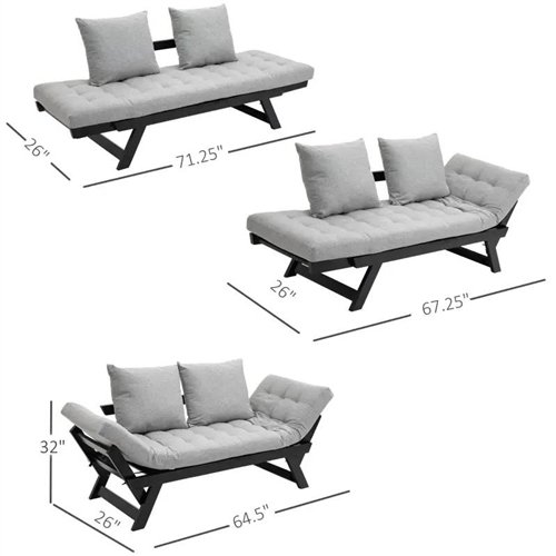 This Charcoal/Black 3 In 1 Convertible Sofa Chaise Lounger Bed w/ 2 Large Pillows looks great with any decor! Both armrests can be independently adjusted up or down to create a loveseat sofa, a couch bed at 71.25" flat, or a chaise lounger, depending on your seating or sleeping needs. Quickly converts from loveseat into a sofa sleeper and back again, which is perfect for a quick relaxing nap or unexpected guests who need a place to sleep. A high-quality thick oak frame creates a sturdy, relaxing base that can support up to 462 lbs of weight, while the linen fabric cover over medium density foam, adds a luxurious, comfortable touch to this convertible sofa bed. The linen fabric pillow cover zips open and is removable for easy cleaning and maintenance of both the cover and the foam pillow on this small sofa.
