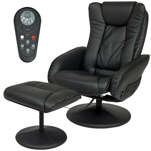 Relax with the Sturdy Black Faux Leather Electric Massage Recliner Chair w/ Ottoman. Comes equipped with 5 pre-programmed massages, 9 intensity levels, and 2 modes to knead the upper and lower back, thighs, and calves. A double-padded backrest with soft cushions on the armrests, seat, and ottoman provides optimal lounging comfort. A wireless massage controller lets you conveniently switch massage settings without moving and store it away in the built-in side pouch after use. Crafted of easy-to-clean faux leather and a sturdy metal frame, this massage recliner and ottoman set is built to last for years to come.