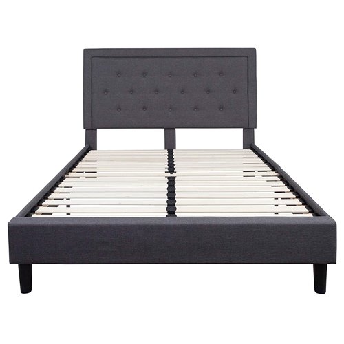 Retreat in style with this Full size Dark Grey Fabric Upholstered Platform Bed Frame with Tufted Headboard. Platform beds are designed to give your room an open concept feel and are perfect for those who don't like high seated beds. One advantage is the soft panel headboard as well as the cushion like base. The headboard features gorgeous nail trimming and button tufted upholstery. The frame features 15 wood slats that are designed to support your mattress without the use of a box spring. Finally, a bedroom designed to give you a comforting and peaceful nights rest.