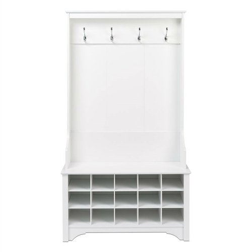A hall tree is an organization superhero. Often combining shoe storage with coat hooks, they're the perfect item for an entryway where kicked-off shoes are running amok. This piece, constructed of manufactured wood, delivers on all the same storage promises. Featuring 15 shoe cubbies, 4 hooks, and a bench, it's sure to help clear up hallway clutter. Constructed with contoured sides and decorative molding, it offers any room a touch of traditional or cottage-inspired charm. Measuring 68'' H x 38'' W x 15.5'' D, it can easily work into rooms with other pieces or be a solo storage anchor.