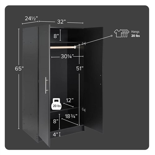 • Ample Storage Space: Description The Wardrobe Closet offers you a wall cabinet and clothes organizer all in one. Designed as a free-standing pantry, this white closet offers a significant internal storage capacity of 18.75" D x 30.25" W x 59" H.