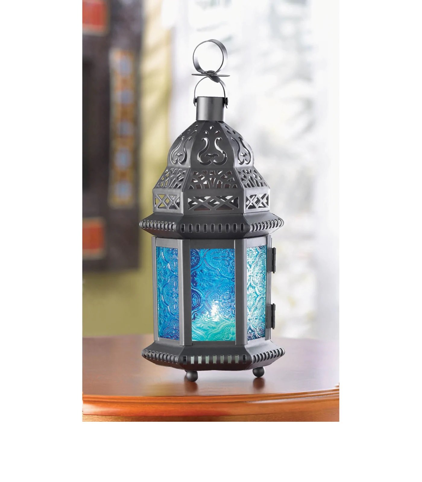 The combination of intricate metal cutouts and ornate glass designs create a gorgeous effect of flickering emerald green light that can either set the tone for outdoor events or cast an exquisite glow on your tabletop. Hinged glass panels make it easy to place the candle or LED light of your choice and is ideal for festive parties, weddings, outdoor lighting or as gifts. Available is a variety of colors including green, red, clear, mulberry, blue, yellow, purple, or amber - find the Moroccan Style Lantern that best fits your home.
