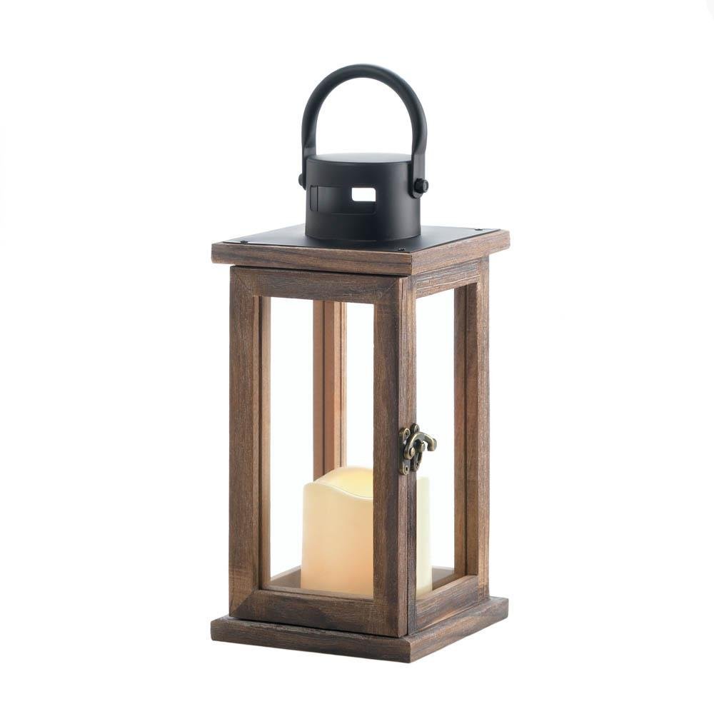 • Light up the night anytime with this rustic wooden lantern that's filled with a modern LED-powered candle. Simply switch it on and you'll enjoy the candle-like glow this lantern spreads across the room.