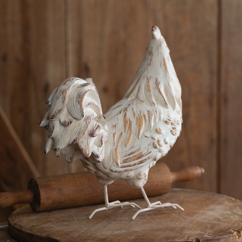 Our farmhouse tabletop chicken features a distressed white figure with sturdy metal legs. It will be a nice touch to any farmhouse decor. Item is made of resin.